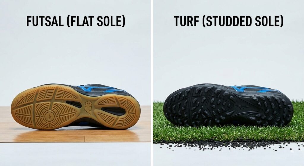 Futsal shoes must have a flat, non-marking rubber sole. Unlike turf shoes, which have small rubber studs, futsal outsoles use herringbone or circular pivot patterns. This allows you to rotate your foot without catching on the floor, preventing knee injuries.